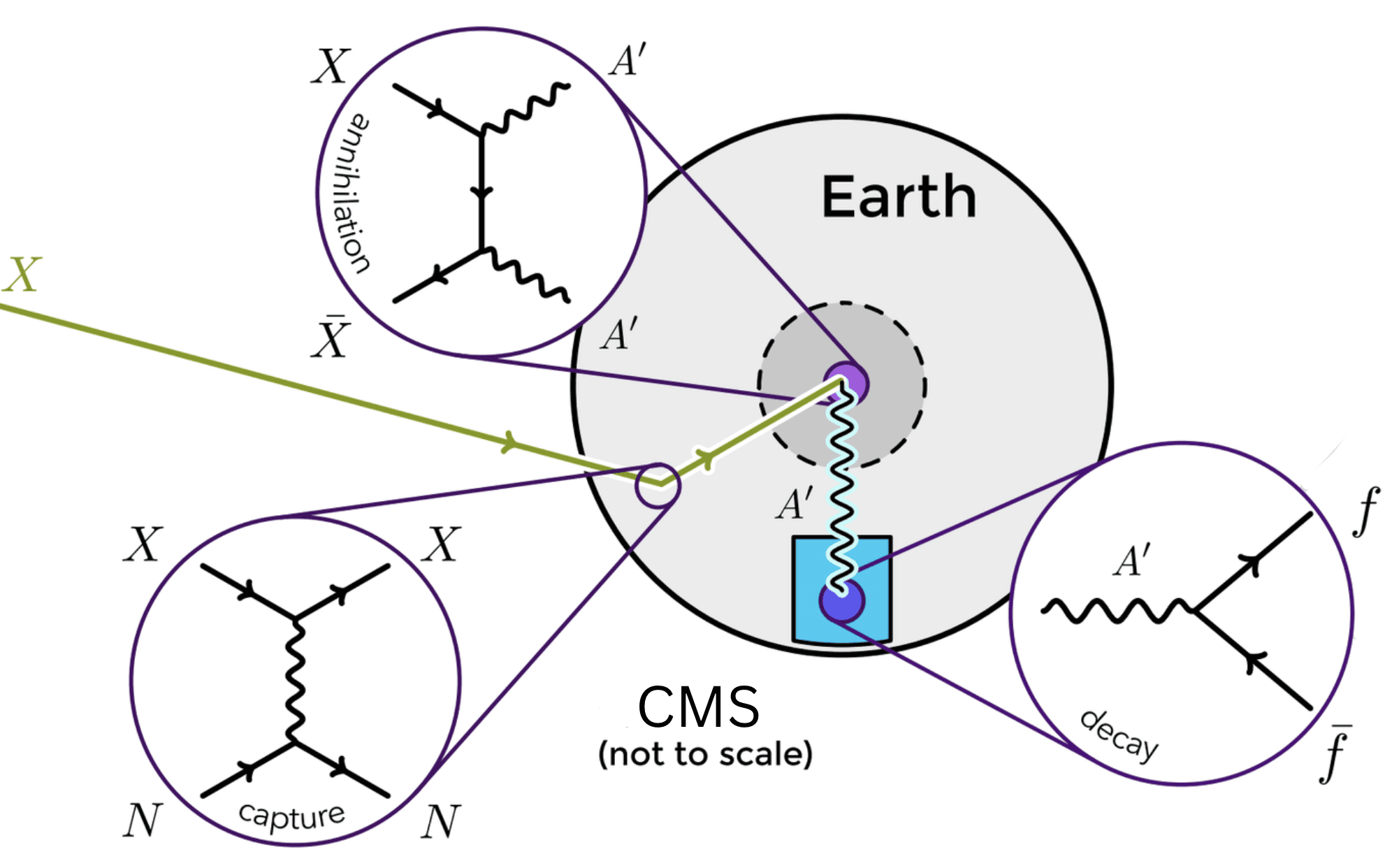 A visualization of Dark Matter becoming trapped, annhilating, and being detected by the CMS detector